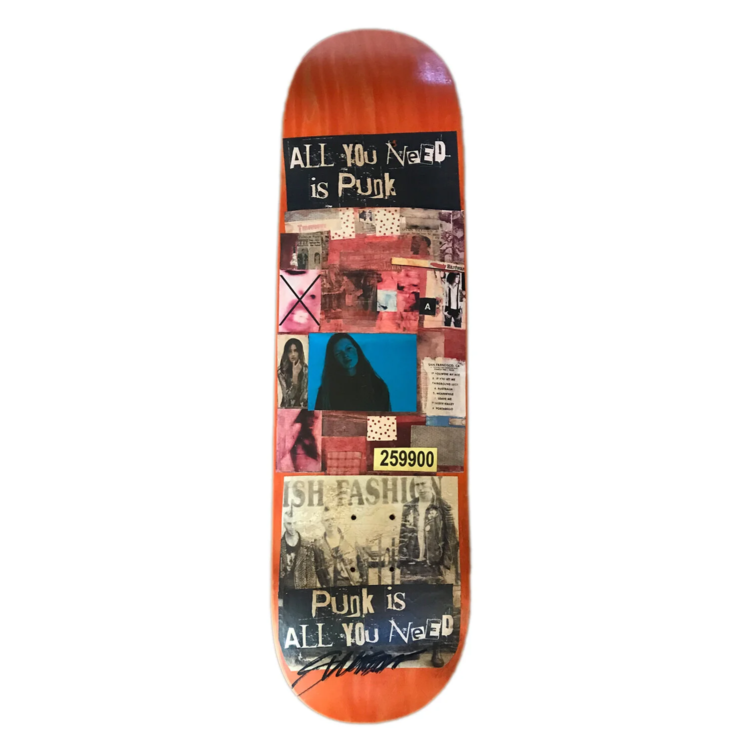 Acrylic paint, spray varnish, collage on 7-ply hard Canadian maple skate deck.